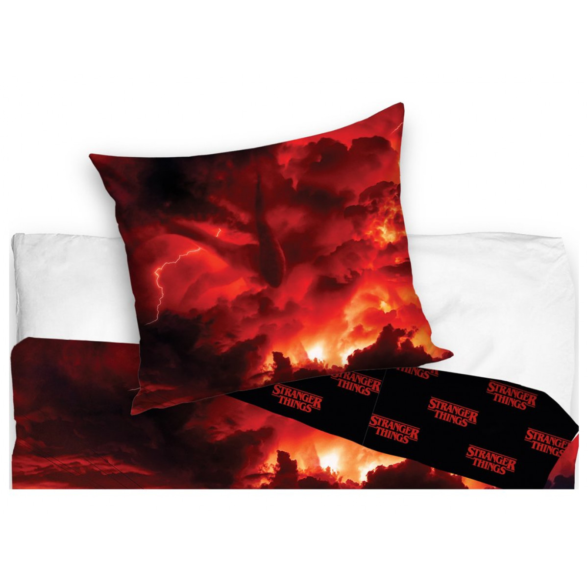 Na lícní straně povlaku přikrývky vidíme "bouři" ze které vychází příšera, proti které však stojí naši hrdinové. Ačkoliv jsou oproti ní jen malí kluci, tak každý správný fanoušek ví, co vše se v nich skrývá. Ve spodní část povlečení vidíme kořeny, které se už po chlapcích sápají. Rubová strana povlaku přikrývky je celá černá a na ní jsou červené loga Stranger Things. Na povlaku polštáře, který je z obou stran stejný, je obrázek příšery v bouři.